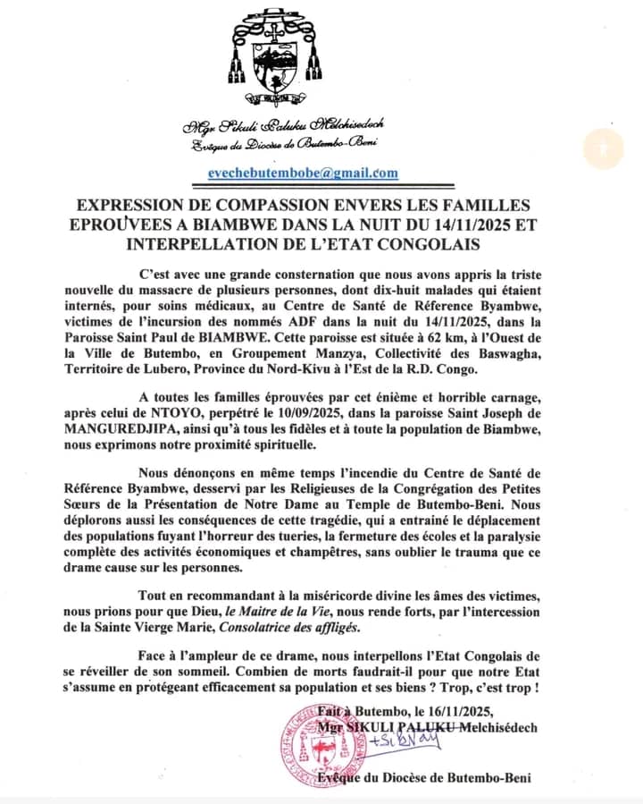 Dans un communiqué publié ce dimanche 16 novembre intitulé "expression de compassion envers les familles éprouvées à Biambwe dans la nuit du 14 novembre 2025 et interpellation de l’état congolais", Mgr Melchisédech Sikuli, évêque de Butembo-beni, a manifesté sa consternation face à la triste nouvelle du massacre de plusieurs personnes, dont 18 malades internés au centre de santé de référence de Biambwe, victimes de l’incursion des Adf, dans la paroisse saint Paul de Biambwe. Dans ce communiqué l’évêque de Butembo-beni dénonce aussi l’incendie du centre de santé de référence de Biambwe appartenant aux religieuses des petites sœurs de la présentation de notre dame au temple de Butembo-beni. Il déplore aussi les conséquences de cette tragédie qui a entraîné les déplacements des populations fuyant l’horreur des tueries, fermeture des écoles et paralysies complète des activités économiques et champêtres. En concluant son communiqué, le prélat catholique interpelle le gouvernement congolais à se réveiller de son sommeil et de s’assumer pour protéger efficacement la population et ses biens. Lire en pièce jointe l'intégralité du communiqué.