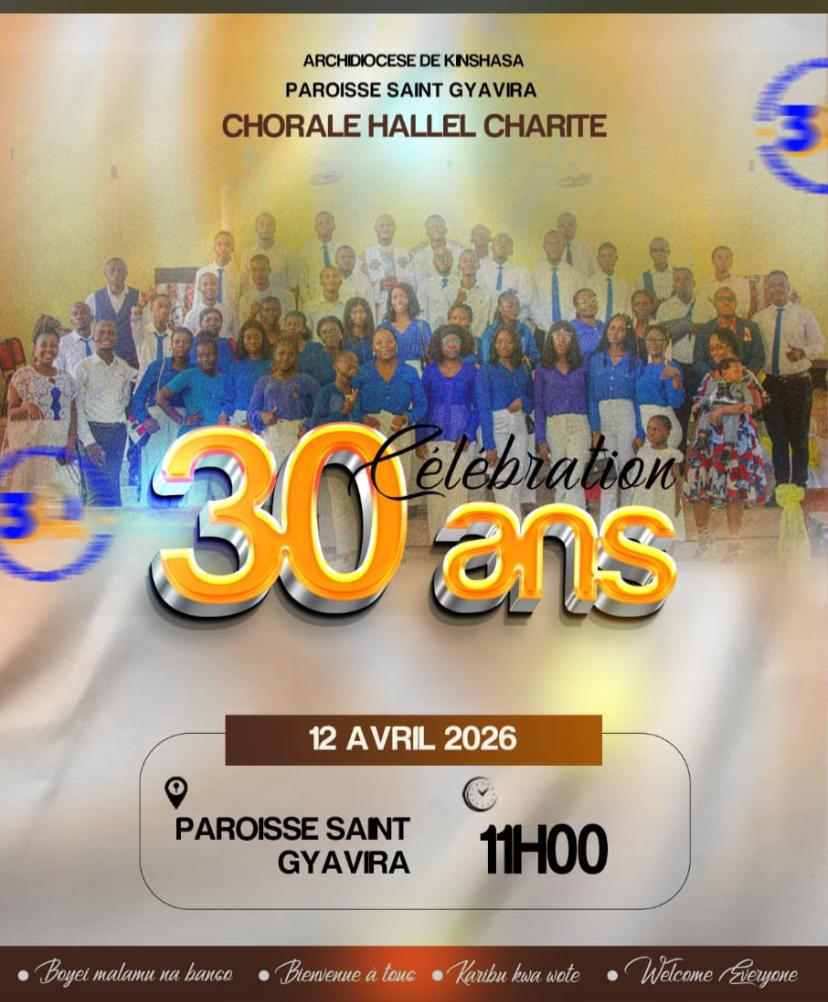 La chorale Hallel Charité de la Paroisse Saint Gyavira, située dans la commune de Ngaliema, au quartier Camp Munganga, a célébré dimanche 12 avril 2026 ses 30 ans d’existence au cours d’une messe d’action de grâce organisée à 11 heures. L’événement a été marqué par une forte communion entre les membres, les fidèles et les invités, ainsi qu’un moment de reconnaissance pour le chemin parcouru depuis la création de la chorale en 1996. Pour lire l’intégralité de l’article, texte en pièce jointe.