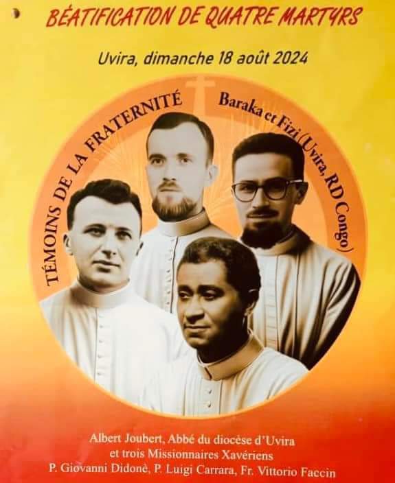 Ce dimanche 18 août 2024, Le cardinal Fridolin Ambongo, archevêque de Kinshasa et représentant du Pape François, a présidé à Uvira, dans la province du Sud-Kivu, la messe de béatification de quatre prêtres martyrs. Il s’agit d’un prêtre congolais Albert Joubert et de 3 missionnaires xavériens italiens Luigi Carrara, Giovanni Didonè et Vittorio Faccin. Ces figures emblématiques, tuées lors de la rébellion Simba en 1964, ont payé de leur vie leur engagement pour la foi chrétienne et la dignité humaine. Qui sont-ils ces prêtres ?