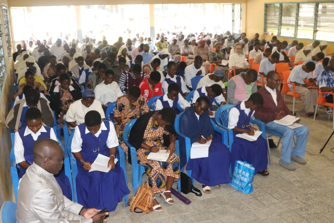 La conférence s’est clôturée par une eucharistie célébrée par Monsieur l’Abbé Jean Baptiste NSUKA, vicaire épiscopale chargé de l’administration et de la vie consacrée représentant personne de Mgr Jean Crispin KIMBENI du diocèse de Kisantu. Dans son homélie il a invité l’Assemblée à parler avec le cœur. Il faut donc que du cœur jaillissent les paroles justes pour édifier, pour construire un monde toujours meilleur où la vérité et la charité se rencontrent et peuvent éclairer conjointement la marche de l’homme vers son horizon final. Le cœur est le lieu de combattre la désinformation qui falsifie et instrumentalise la vérité. En effet, poursuivant son homélie, l’officiant du jour a ajouté que les fausses informations nuisent gravement à la société et à la dignité humaine. Cela peut gangrener nos communautés et devenir un fléau alarmant. Il a invité les formés et tout le public au discernement dans l’usage de ces moyens techniques et avoir pour critère de consommation : grandir en humanité et cultiver au plus haut point l’amour de Dieu. Plus de 250 formés et formées et leurs formateurs ont pris part à cette journée. Cette dernière s’est clôturée par une grande photo de famille et un petit verre d’amitié. D’autres conférences sont prévues pour d’autres couches sociales les jours à avenir.