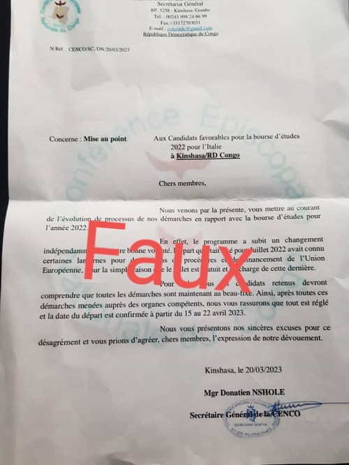 Le lundi 22 mai 2023, Mgr Donatien Nshole, Secrétaire général et Porte-parole de la CENCO, a, devant la presse au Centre interdiocésain à Kinshasa, rendu public le communiqué de la CENCO se rapportant aux marches pacifiques organisées le samedi 20 mai 2023 dans la capitale congolaise. Ci-dessous le communiqué lu par le Chapelain de sa Sainteté le Pape François.