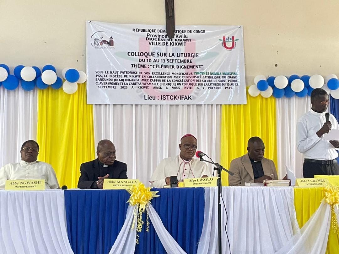 Le samedi 13 septembre, le diocèse de Kikwit a clôturé son colloque sur la liturgie organisé du 10 au 13 septembre 2025, à l’Institut Supérieur Technique Catholique de Kikwit (ISTCK) sur le thème évocateur: «célébrer dignement». Prêtres, religieux et religieuses, séminaristes, responsables paroissiaux des commissions de la liturgie et d’autres fidèles ont pris part à ces assises. Mgr Timothée BODIKA Mansiyai, Pss, Évêque du diocèse de Kikwit qui a convoqué cette grande assemblée a voulu que les fidèles de son diocèse soient formés et informés à la célébration digne des mystères du salut à travers une liturgie digne et conforme aux exigences de l’Eglise. Plusieurs conférences ont été animées pendant les trois jours par les liturgistes venus de plusieurs coins du pays et de l’étranger. Parmi eux, nous pouvons signaler la présence remarquable de leurs excellences messeigneurs Bernard LIKOLO et Jean Pierre KWAMBAMBA, respectivement évêque du diocèse de Lisala et du diocèse de Kenge en République Démocratique du Congo. Le premier jour, après le discours inaugural de Mgr Timothée BODIKA pss, évêque de Kikwit, trois conférences suivantes se sont succédées: «célébrer dignement l’eucharistie», « le rite zaïrois de la messe», « la contextualisation de la liturgie des heures sur les traces de saint Augustin d’Hipone». Au deuxième jour les conférences ont tourné autour des thèmes suivants: «beauté et vérité dans la liturgie de l’eucharistie catholique», «la liturgie et la vie de l’Eglise», «langue musicale, chants conformes et non conformes, direction des chorales, instruments», «place du chant et usage des instruments de musique dans la célébration liturgique». le troisième et dernier jour a connu les conférences ci-après: « le problème de la forme liturgique dans la paroisse», «la liturgie et la vie des fidèles», «prêcher: une saveur et un labeur», «pastorale et liturgie». Par des questions et débats, les participants à ce colloque ont été éclairés et édifiés par les réponses des conférenciers. A l’issu des assises, une commission a été mise sur pieds pour dégager les recommandations qui seront mises à la disposition de tous les fidèles du diocèse de Kikwit. Tout s’est clôturé par le discours final de remerciement de Mgr Timothée BODIKA évêque de Kikwit aux conférenciers, aux participants et aux hommes et femmes de bonne volonté qui ont soutenu d’une manière ou d’une autre la réalisation de ce colloque.. l’évêque de kikwit émet le vœu que la façon de célébrer la liturgie dans le diocèse de Kikwit, après ce colloque, s’améliore.